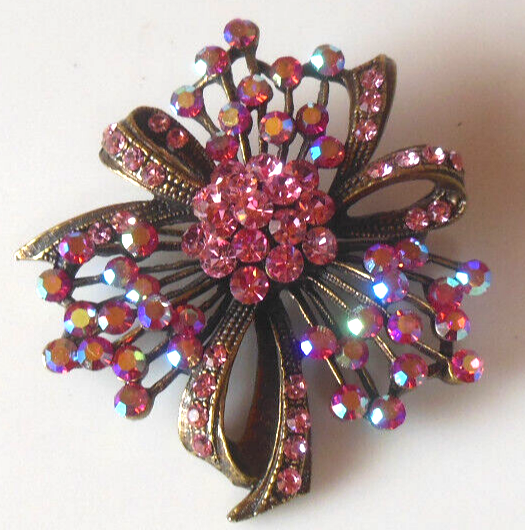 Vintage Gold-tone Aurora Borealis Pink Rhinestone Flower Brooch