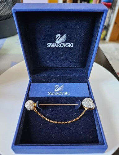This vintage Swarovski stick pin features a heart-shaped design adorned with clear crystals in a gold-tone setting. The pin is 3 inches long and signed by Swarovski, known for their high-quality crystal jewelry. The heart shape, pave setting style, and use of clear crystals make this pin a timeless and elegant accessory that can add a touch of sparkle to any outfit.