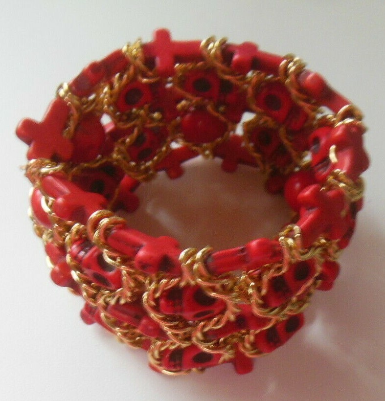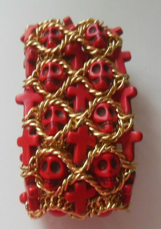 Wide Red Skull & Cross Gold-tone Chain Stretch Bracelet Halloween