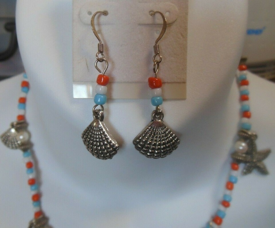 Blue/Orange/White Glass Bead Faux Pearl Nautical Charm Necklace Earring Set
