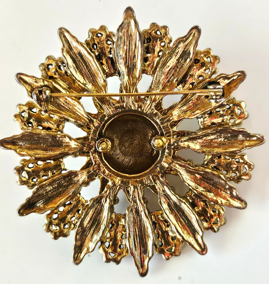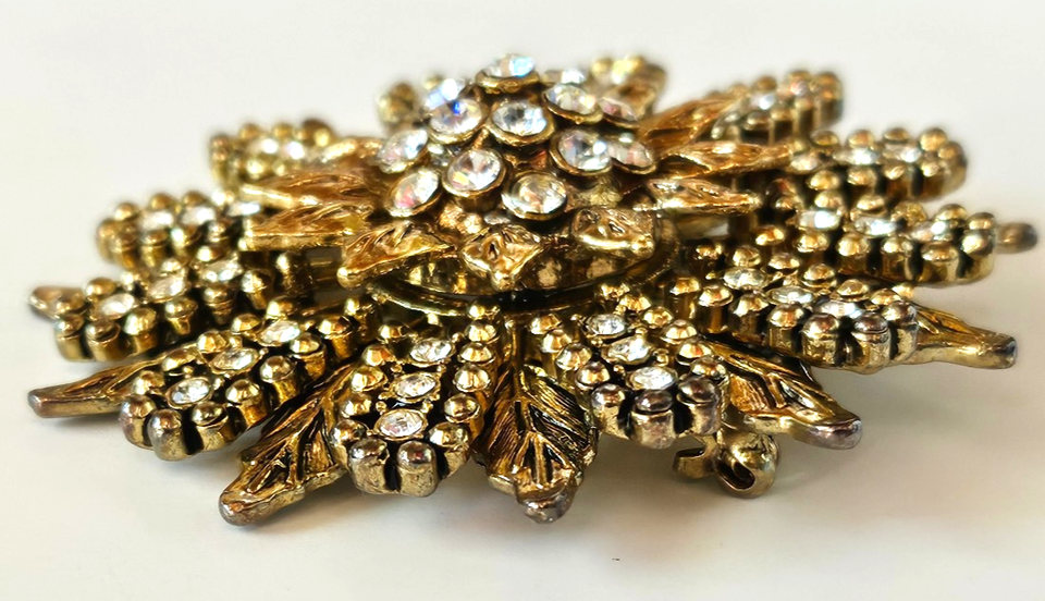 This vintage brooch features a starburst flower design with clear rhinestone clusters, giving it a sparkly and elegant look.