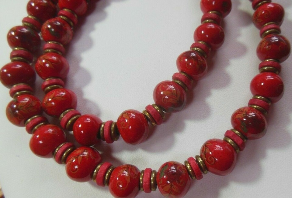 Vintage Hand Painted Floral Glass Bead Necklace W/Brass Coral Spacers