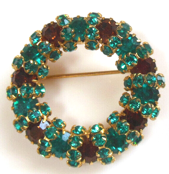Vintage Gold-tone Teal & Brown Rhinestone Wreath Brooch 1.3/8" Diameter