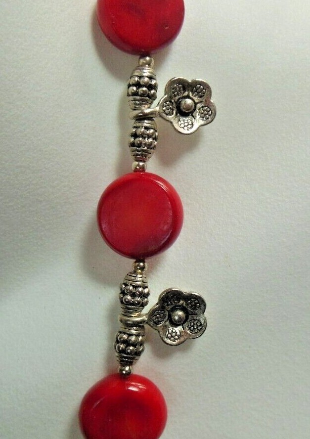 Vintage Red Coral Necklace W/Metal Flower Charm spacers Heart-Shaped Toggle 19"