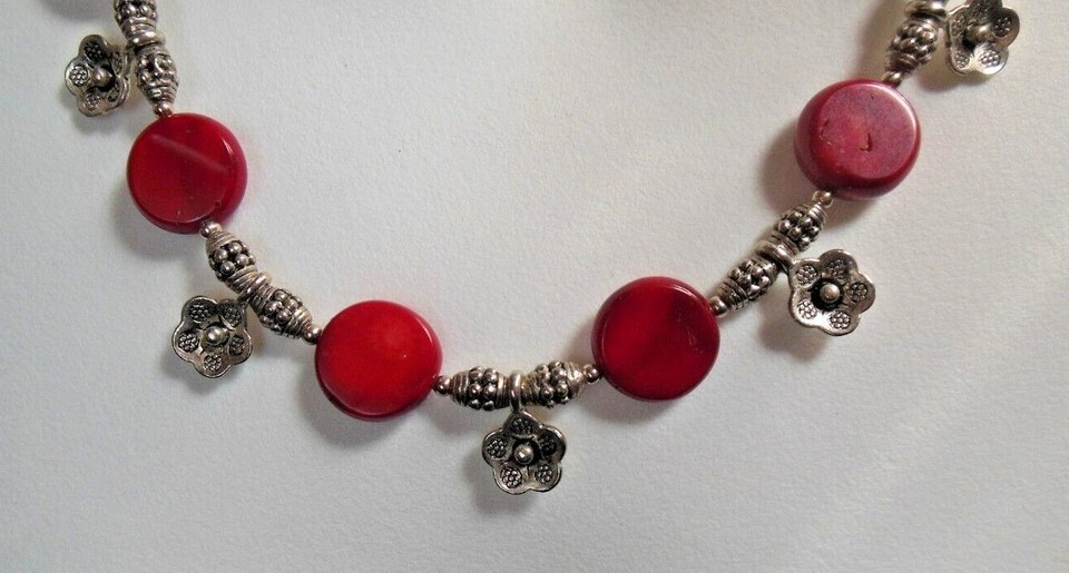 Vintage Red Coral Necklace W/Metal Flower Charm spacers