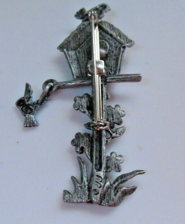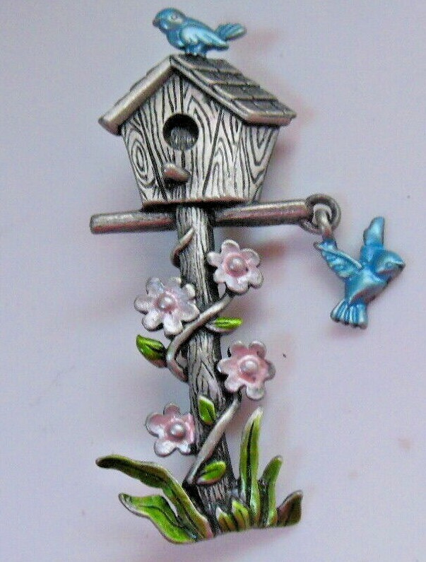 Vintage Signed JJ Bird House Brooch Enamel Flowers Birds