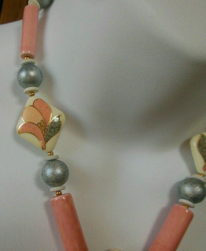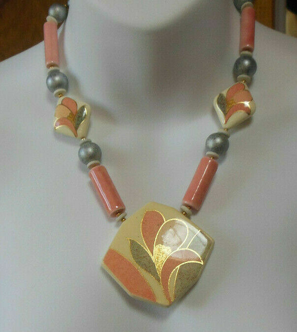 Beautiful Vintage Signed Japan Floral Ceramic Tensha Necklace