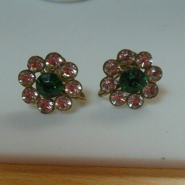 Vintage Silver-tone Green & Clear Rhinestone Floral Screw-back Earrings