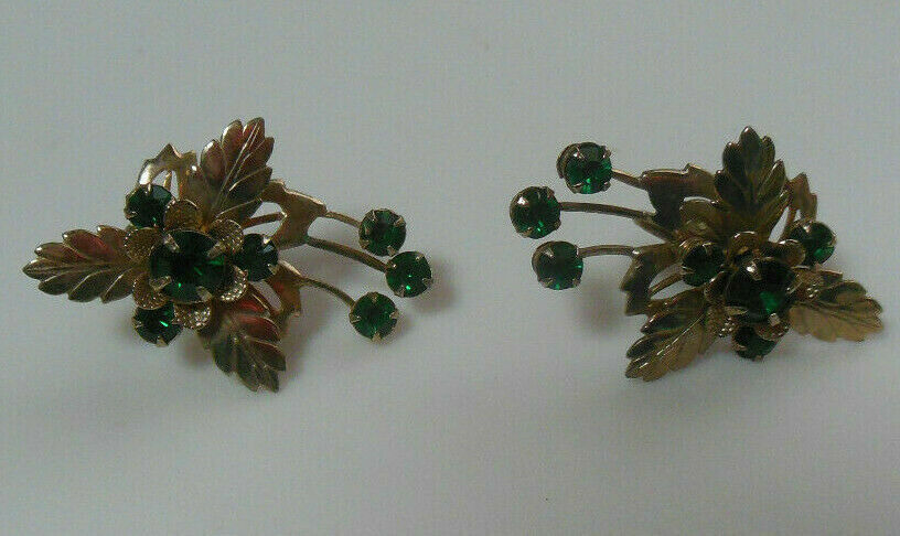 Vintage Stunning Gold-tone Green Faceted Prong Set Rhinestone Flower Screw-back Earrings