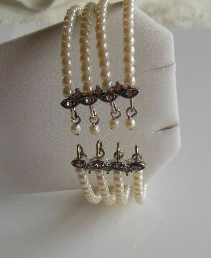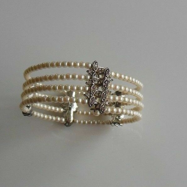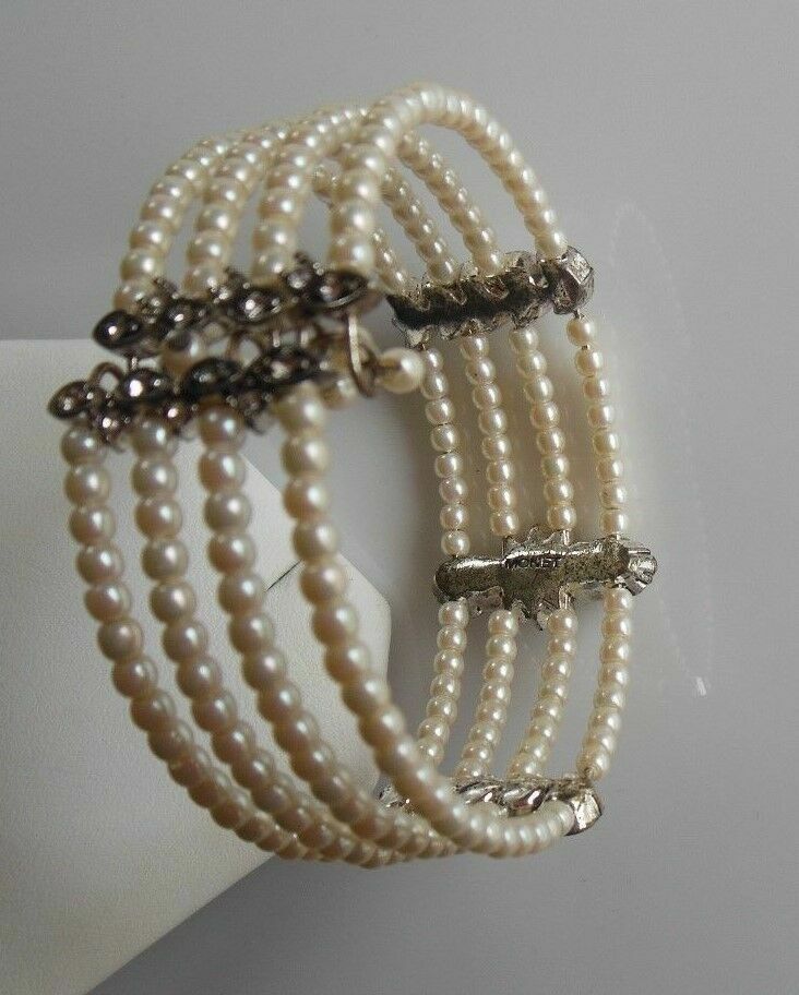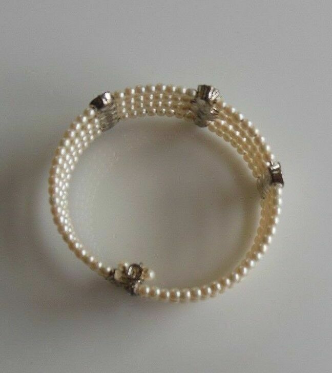 This beautiful bracelet features four rows of faux pearls strung on memory