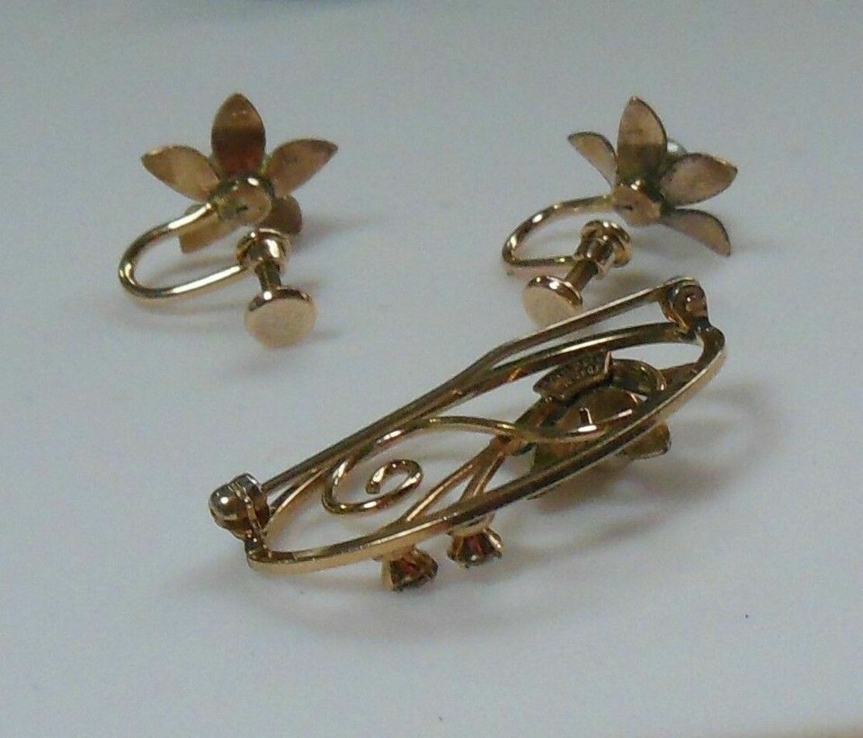 “Has some minor wear on back of brooch & earrings” |