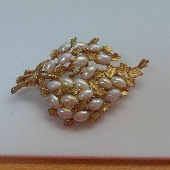 Vintage Signed BSK Gold-tone White Bead Brooch