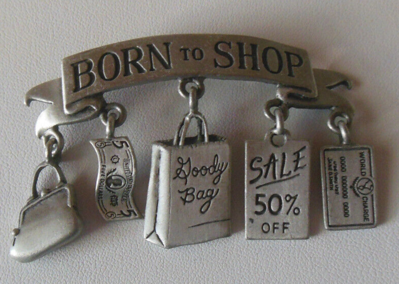 Vintage Signed JJ Born To Shop Pewter Dangle Charm Brooch