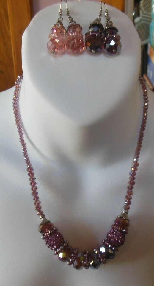 Purple/Pink Faceted Pave Crystal Glass Necklace Earrings Set