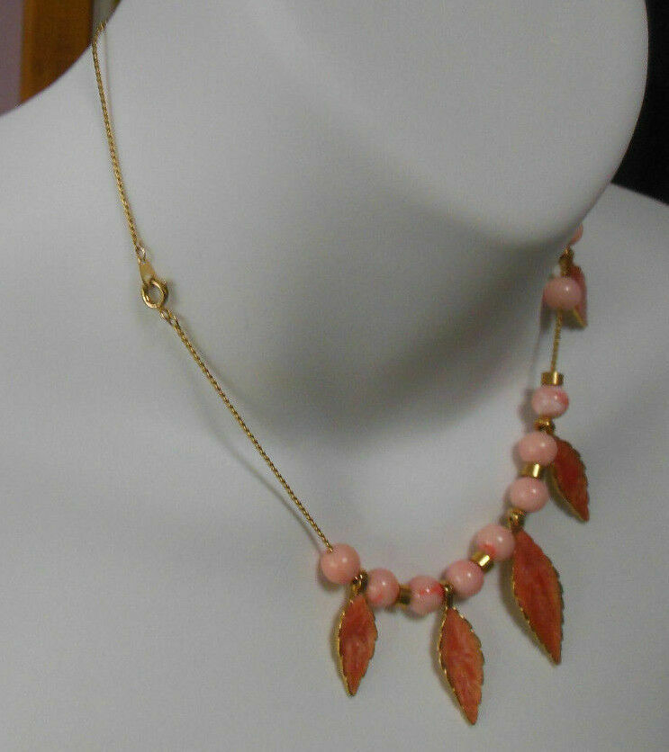 Gold-tone Chain Enamel Leaf and Pink Bead Necklace