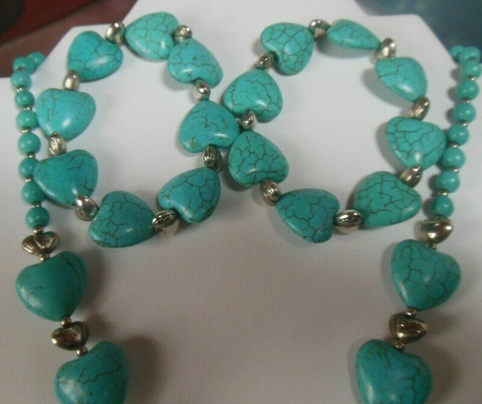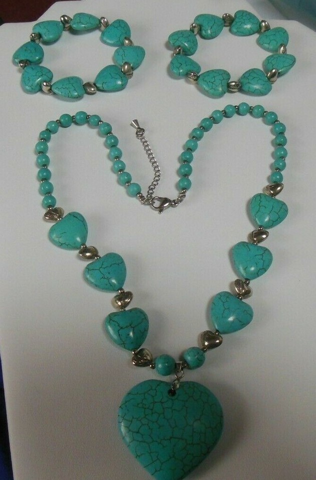 Vintage Silver-tone Faux Turquoise Heart Pendant Necklace 2 Bracelets