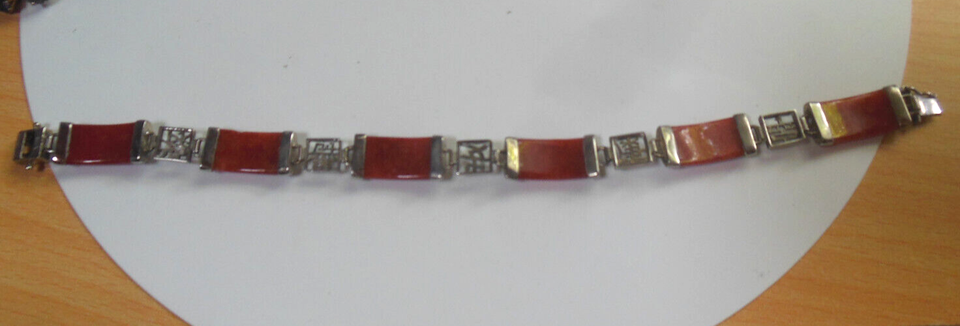925 Sterling Silver Red Jade Chinese Bracelet 7.5"