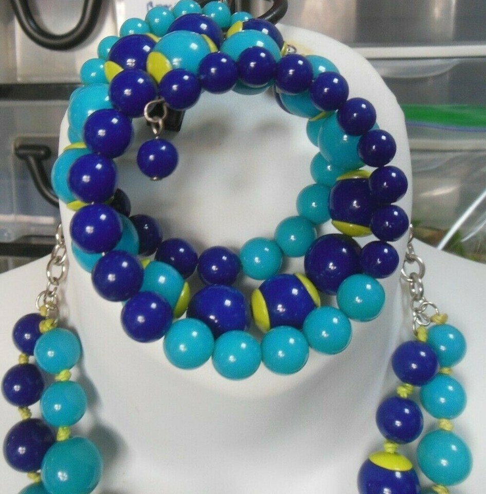 Vintage Heavy Graduated Blues Bead Necklace W/Lime Green End-caps Bracelet Set