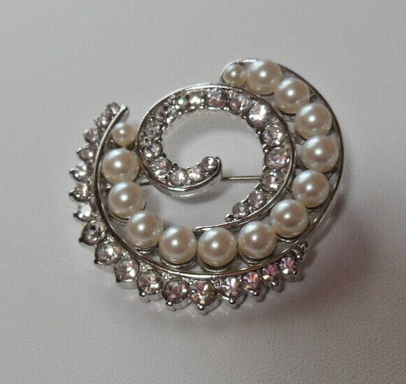 Vintage Signed Monet Silver-tone Pearl Rhinestone Swirl Brooch