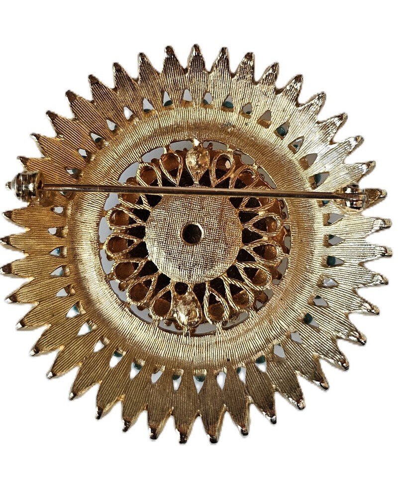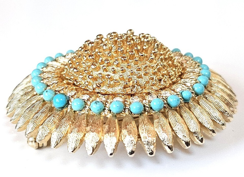This vintage layered gold-tone textured brutalist flower brooch with turquoise beads is a unique and stylish addition to any jewelry collection. Measuring 2" in diameter, this brooch features a beautiful flower shape with a textured design and blue turquoise beads for a pop of color. The combination of metal, beads, and rhinestones gives it a luxurious and eye-catching look, perfect for fashion-forward individuals looking to make a statement.