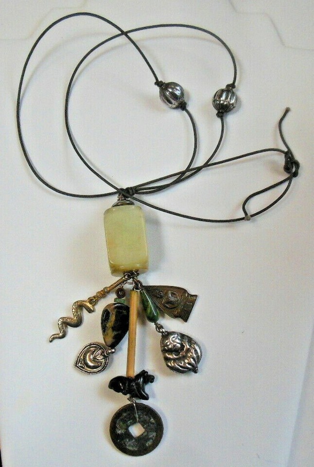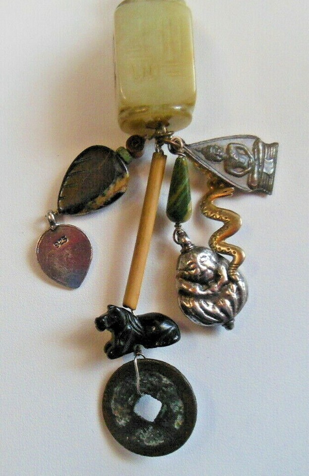 Vintage Jade Bamboo Jasper Brass, 925 Old Chinese Coin Necklace Estate Find