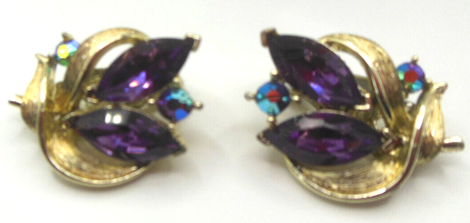 Vintage Signed Lisner Purple & AB Rhinestone Clip Earrings 1" x 7/8"