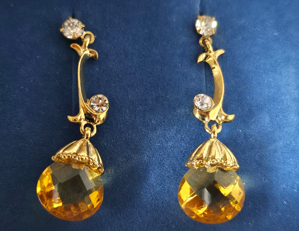 These AVON Extraordinary Briolette Vine Earrings in Goldtone from 2005 are vintage earrings with a teardrop shape featuring light amber briolette rhinestones. The dangle/drop style adds a touch of elegance to any outfit. Made by Avon, these earrings are a timeless piece of fashion jewelry that can be worn for various occasions.