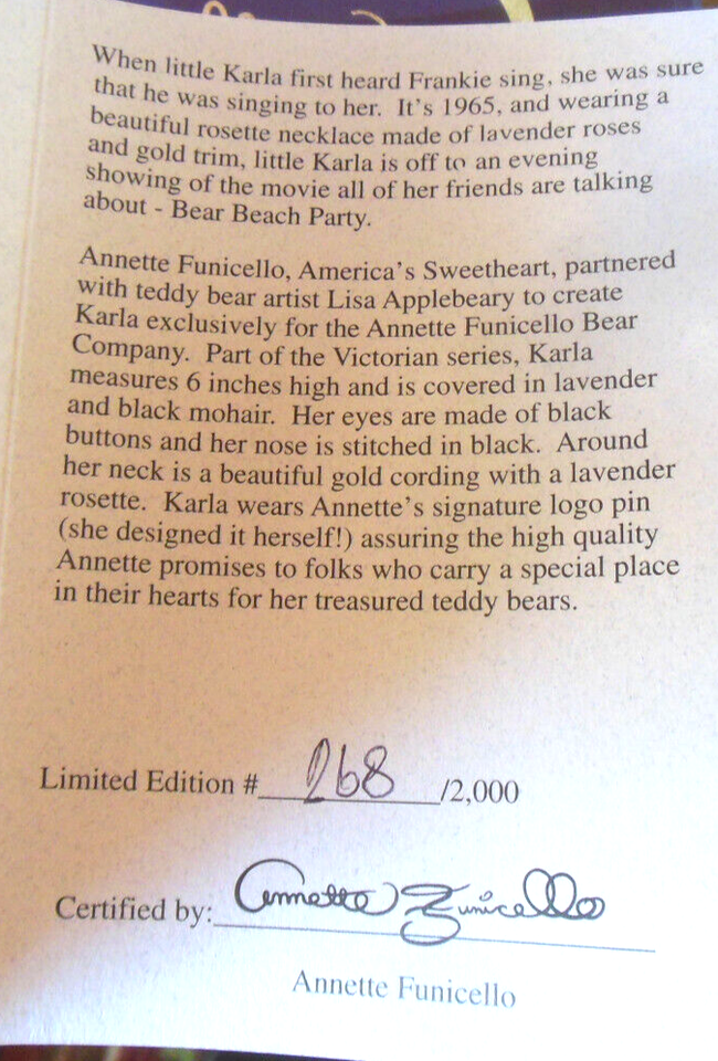 Annette Funicello Collectible Bear Karla 6" -W/Error- see Description"