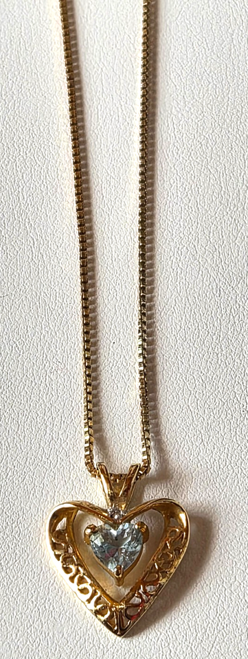 This Signed JJT 925 Blue Topaz Heart Pendant Necklace from Italy features a beautiful blue topaz stone set in vermeil metal with a gold color. The heart shaped pendant is 3/4" x 5/8". The chain is 18 inches in length. The elegant design and high-quality craftsmanship make this piece a stunning addition to any jewelry collection.