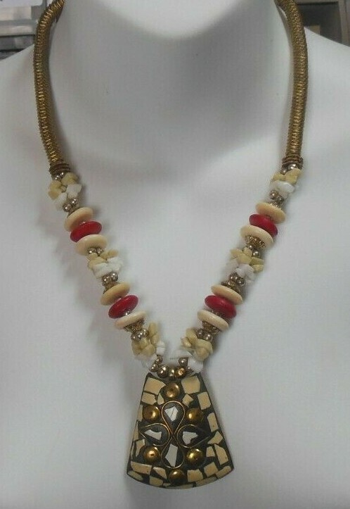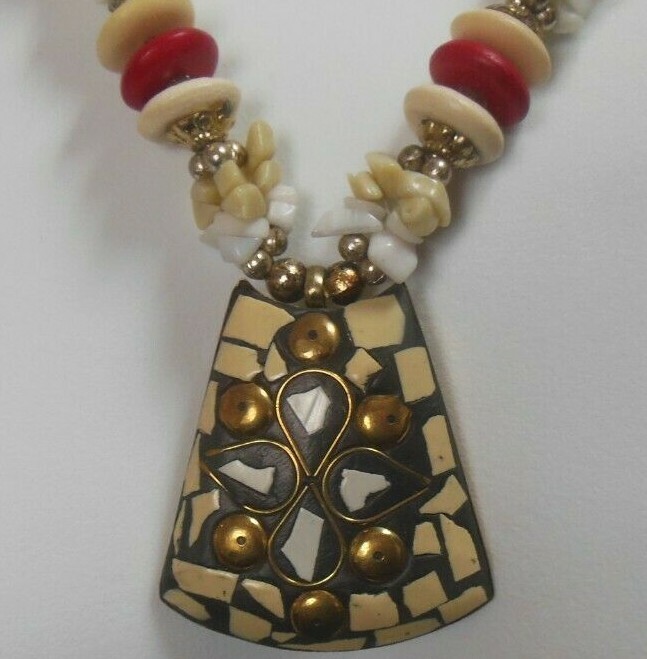 Vintage Coral Bead & Nugget Brass & Enamel Inlay Pendant Necklace