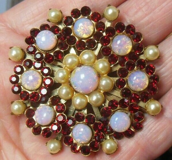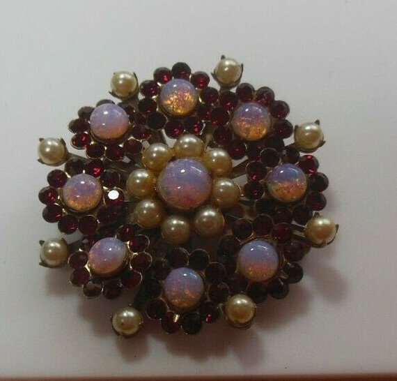 Vintage Ruby Red Rhinestone Pearl and Opalescent Floral Filigree Brooch