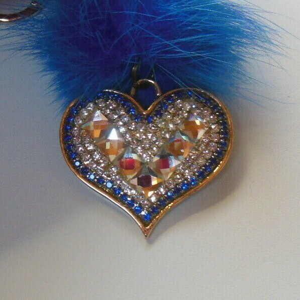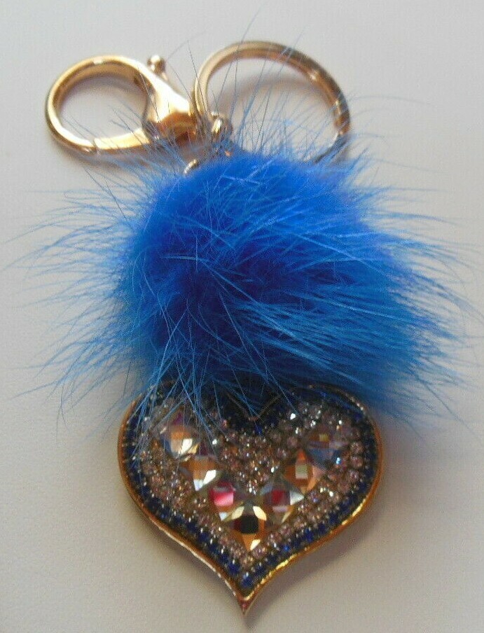 Signed Dana Stein Blue Fluffy Fur Ball Keychain Rhinestones