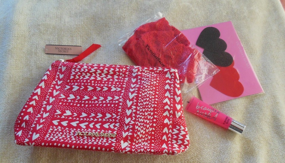 Gifts Included with this bag are: Victoria's Secret Beauty Rush Lip Gloss-Love Berry, Red Body by Victoria Lace Thong-One Size and Victoria's Secret one pair each of gitter heart and satin heart Show Stoppers