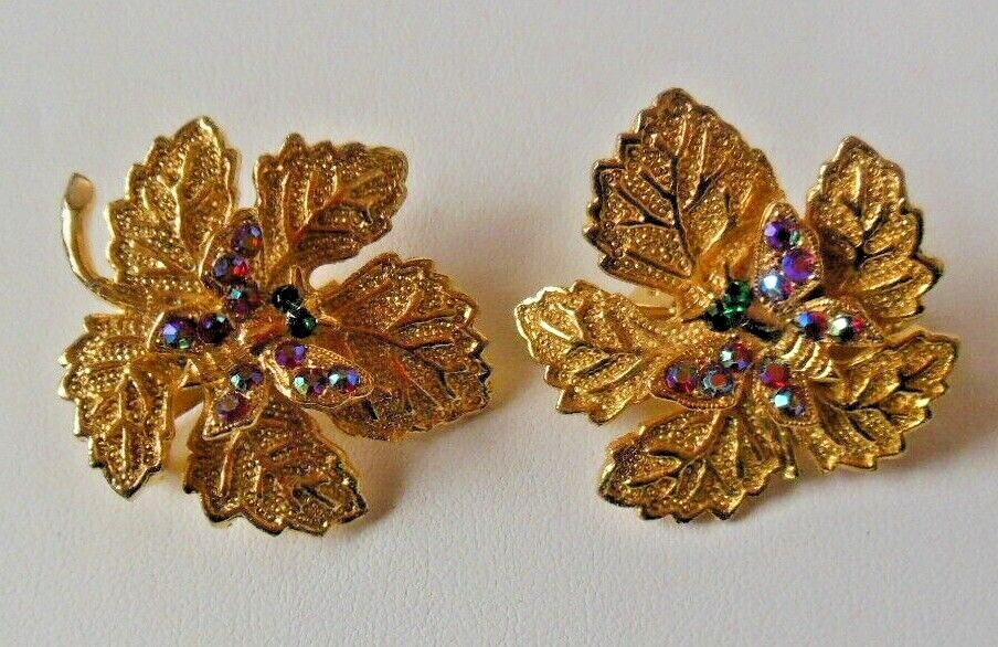 Vintage AB Rhinestone Green Rhinestone Eyes Butterfly Leaf Brooch Set of 2