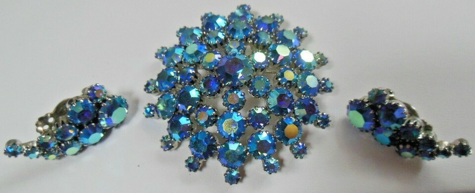 Vintage Blue Iridescent Rhinestone Brooch & Matching Clip-on Earrings