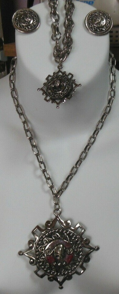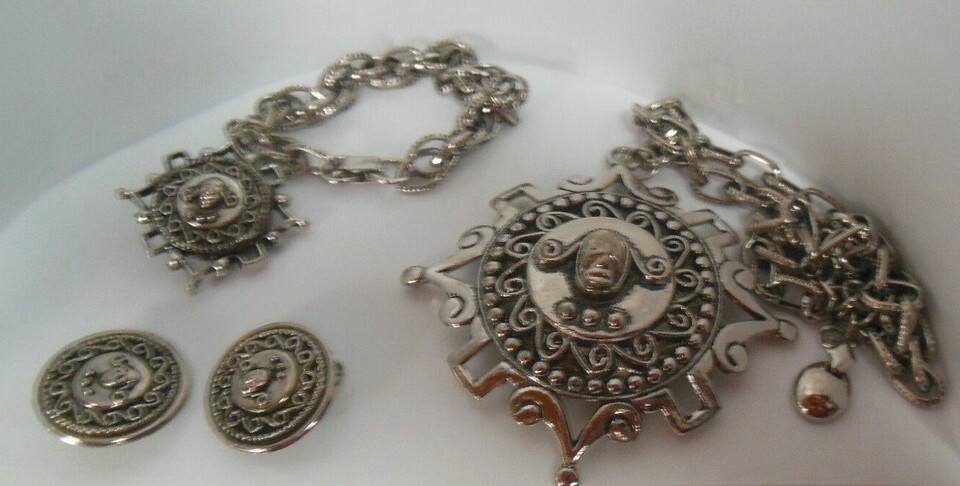 Vintage Silver-tone Figural Large Pendant Necklace, Bracelet & Clip Earrings