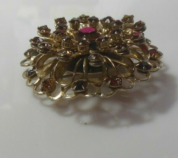 Vintage Gold-tone Amber Colored Layered Prong-set Rhinestone Filigree Brooch