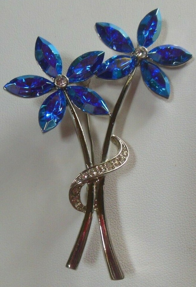 Vintage Silver-tone Faceted Blue Glass Clear Rhinestone Flower Brooch