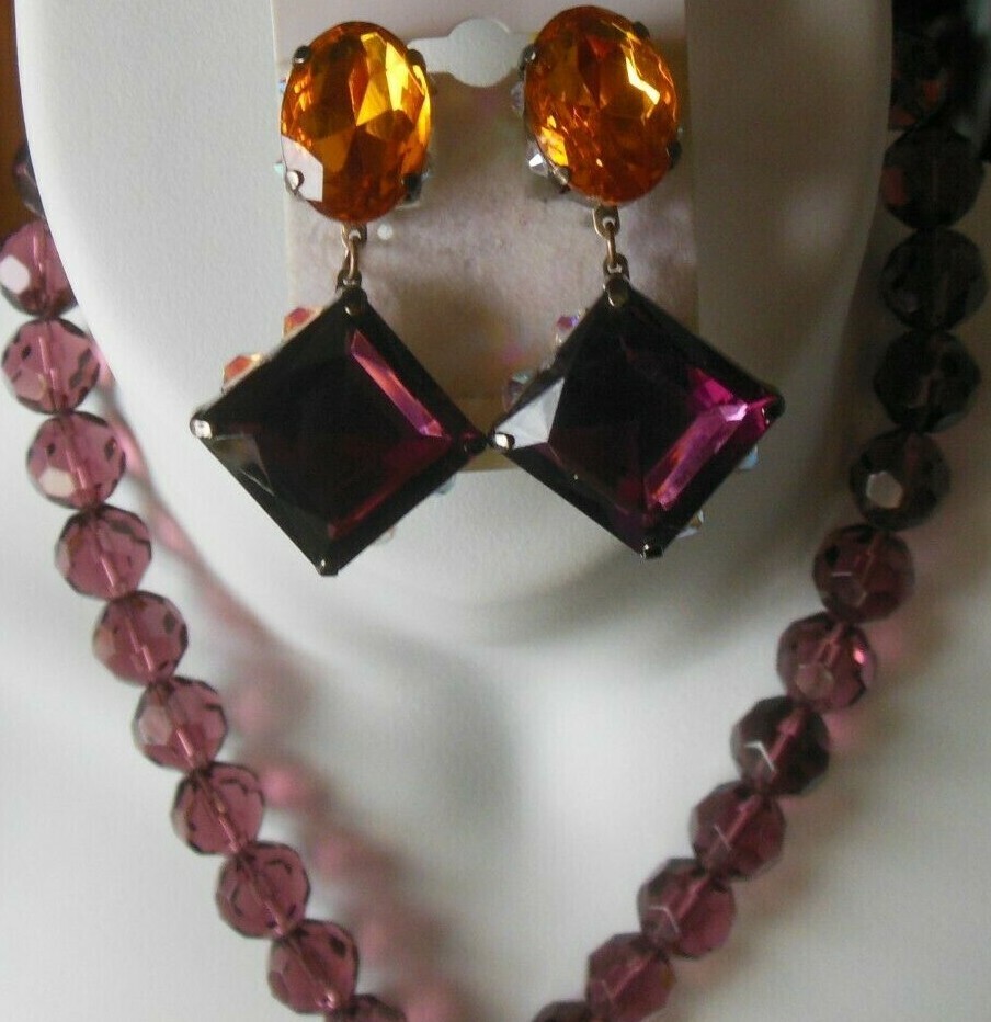 Vintage Heavy Silver-tone Purple Multi-Faceted Glass Necklace & Earrings