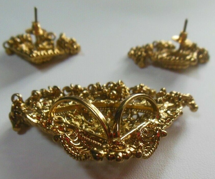Vintage Gold Tone Filigree Chandelier Rhinestone Dangle Pendant & Earrings