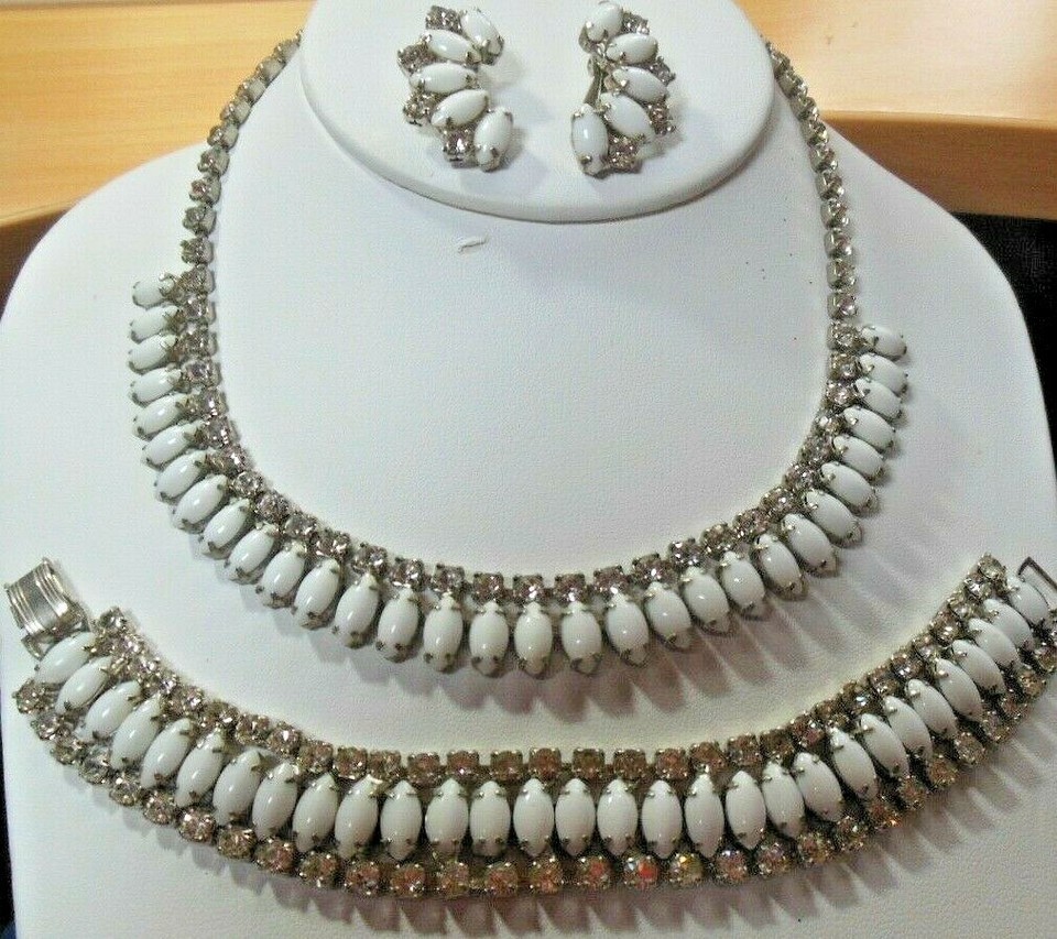 Vintage Clear & Milk Glass Rhinestone Necklace, Bracelet & Clip-on Earring Set