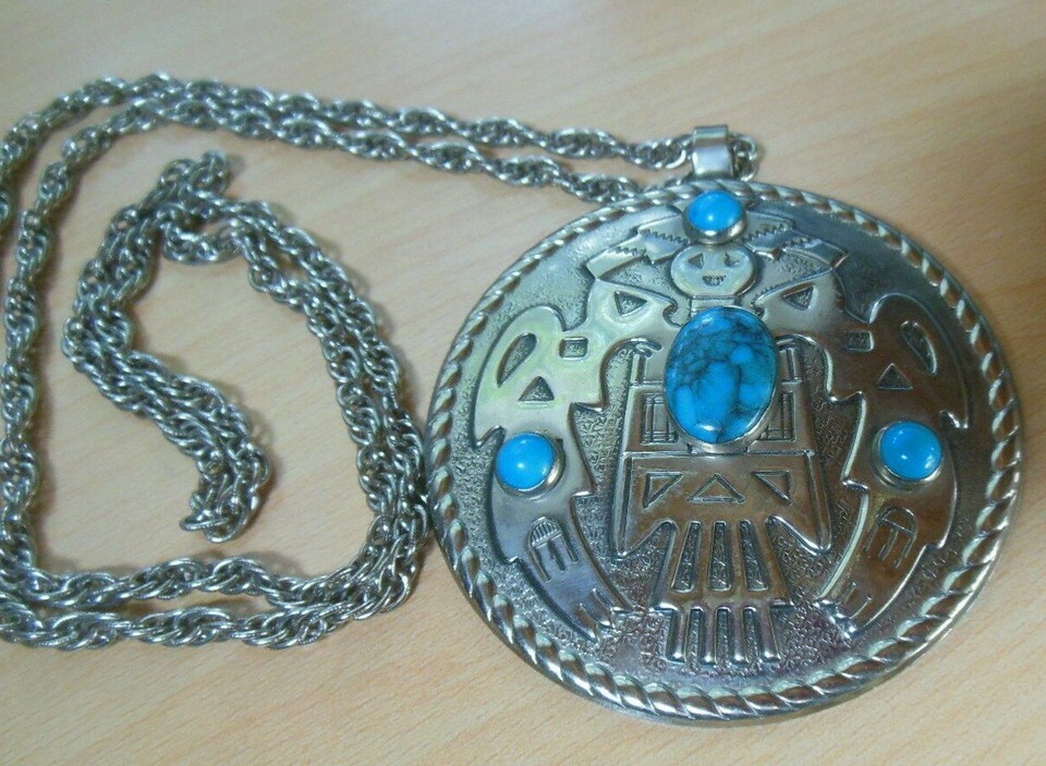 Vintage Signed Bell Nickel Silver Faux Turquoise Pendant Chain Necklace