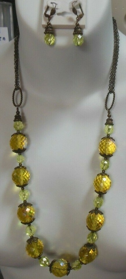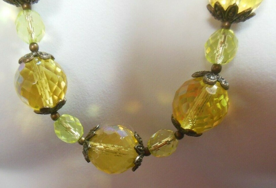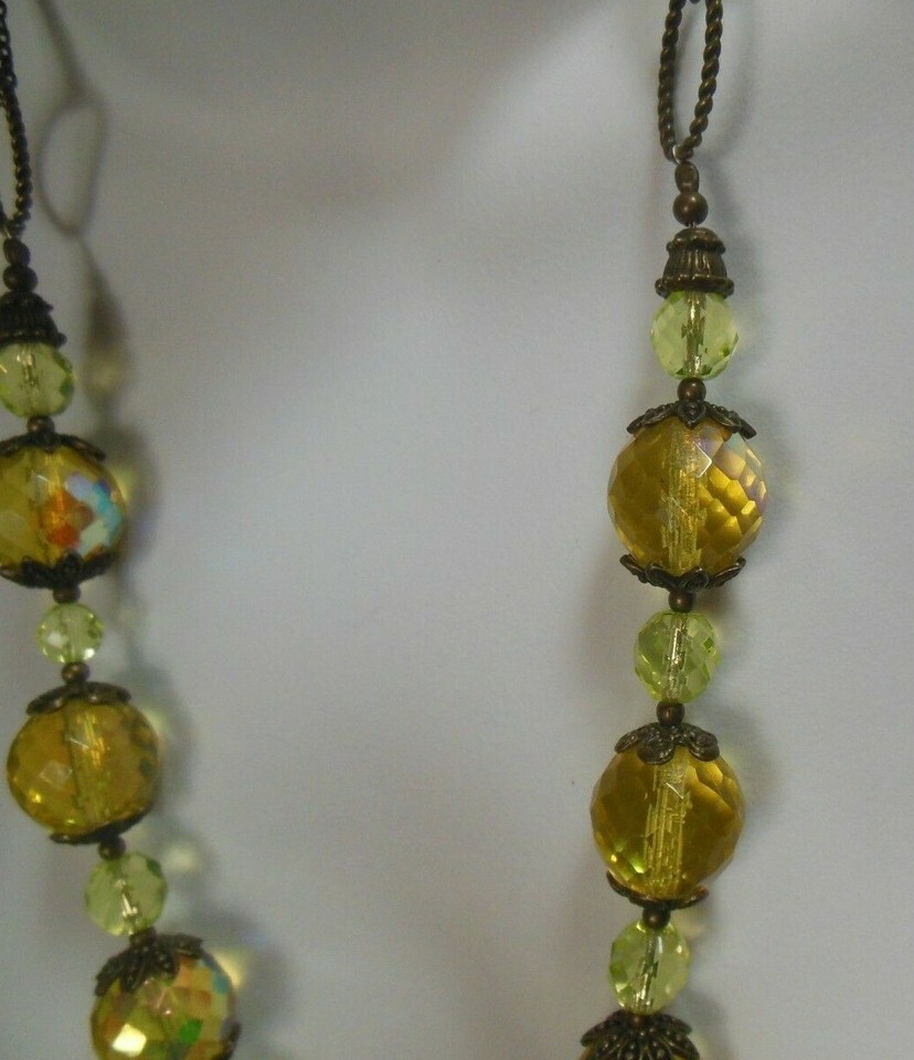 Vintage Heavy Bronze-tone Art Deco Yellow Czech Glass Necklace & Earrings Set