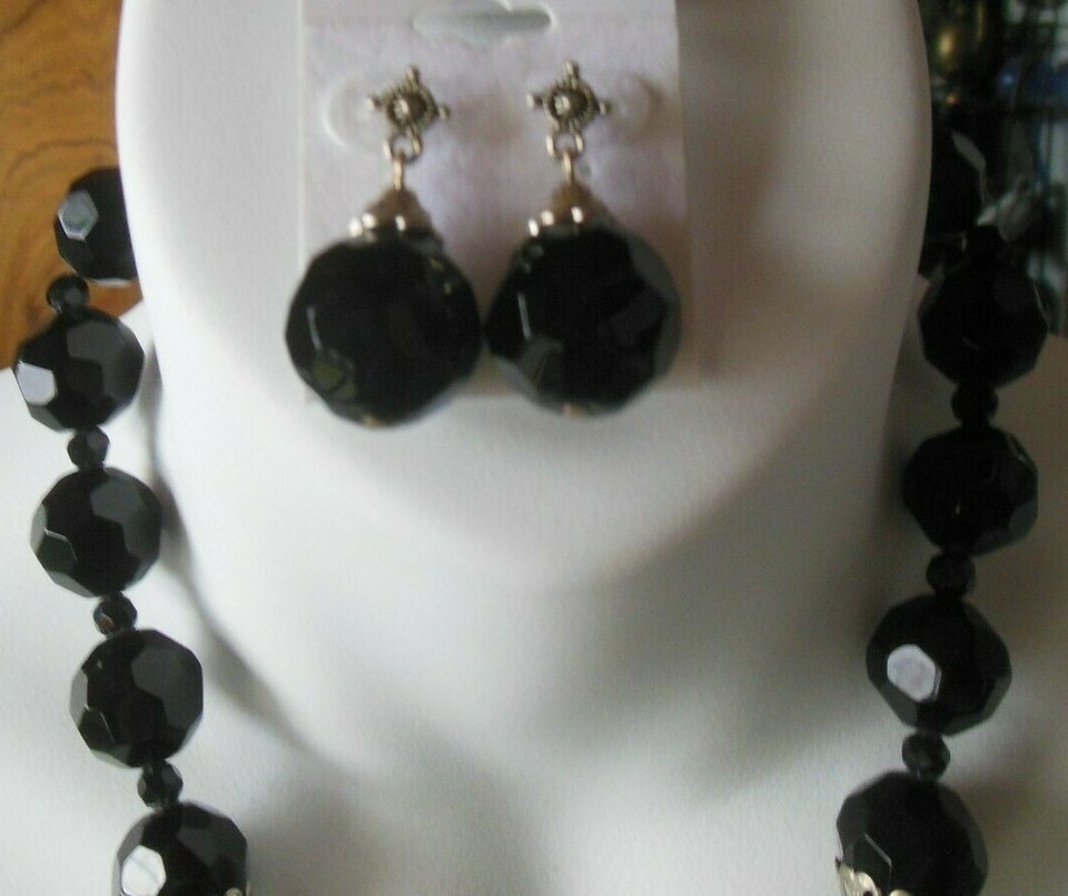 Vintage Heavy Silver-tone Black Multi-Faceted Green Glass Necklace Earrings