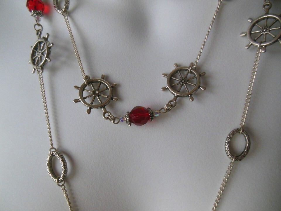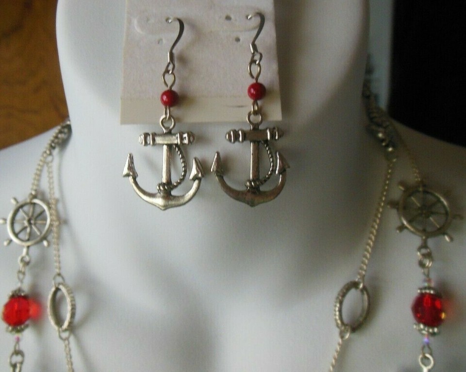 Vintage Silver-tone Chain Blue/Red Czech Glass Nautical Necklace Earrings Set