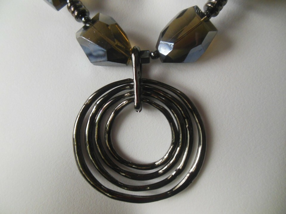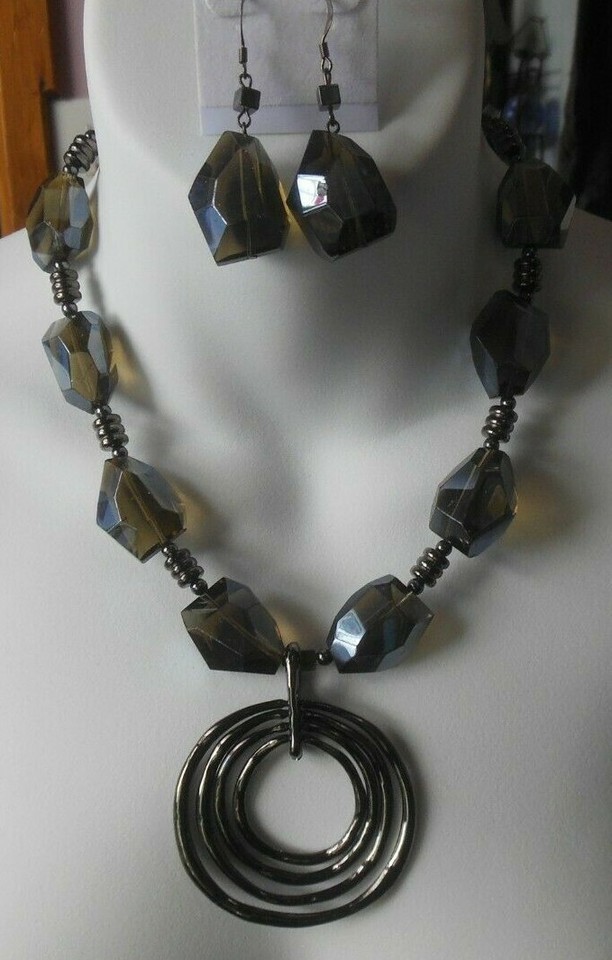 Vintage Heavy Greenish brown Translucent Multi-Faceted Glass with hematite spacers and hematite Pendant Necklace Earrings Set