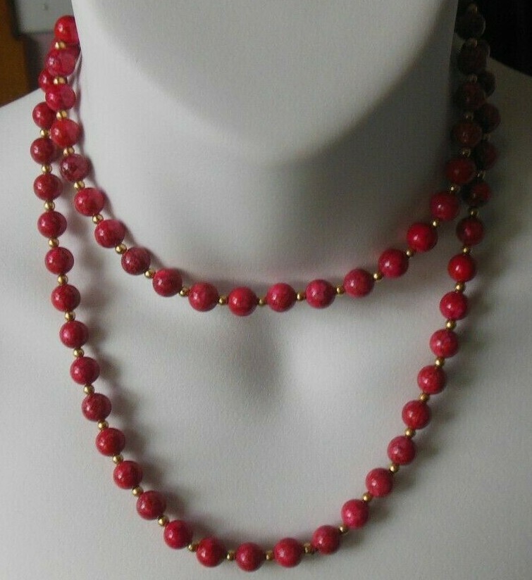 Vintage Endless Long Cherry Red Marbled Glass Bead Necklace W/ Gold-tone Spacers