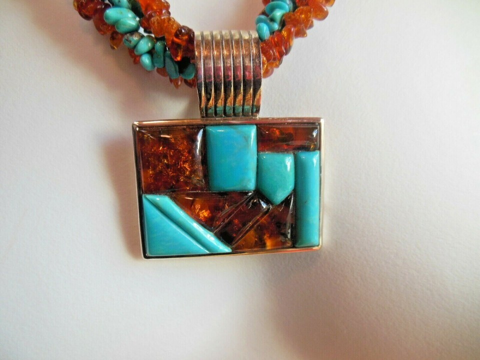 JAY KING 4 Strand 925 Sterling Silver Turquoise & Amber Pendant Necklace