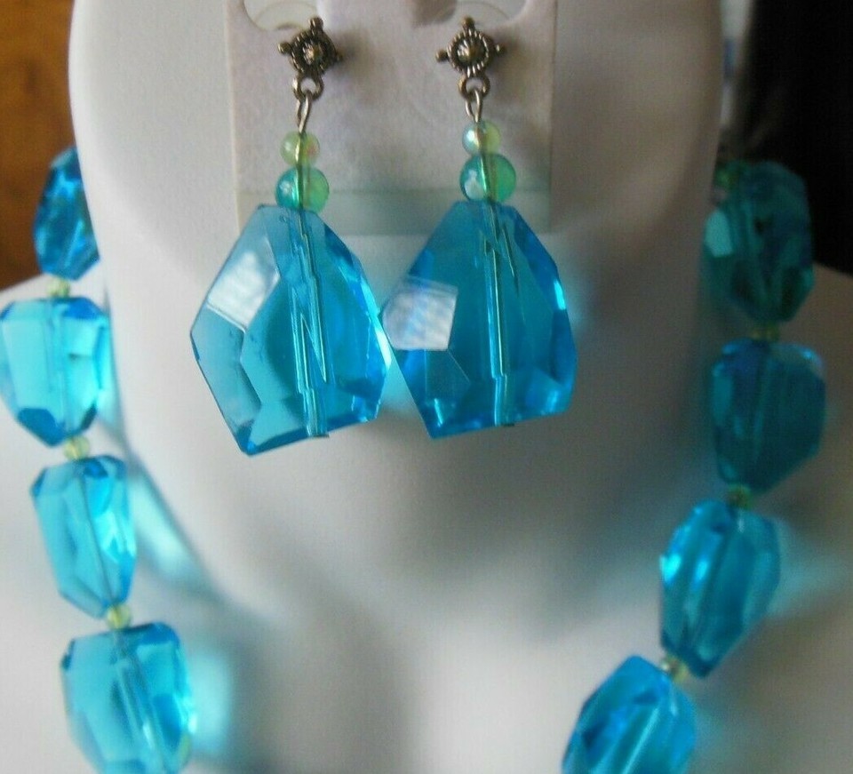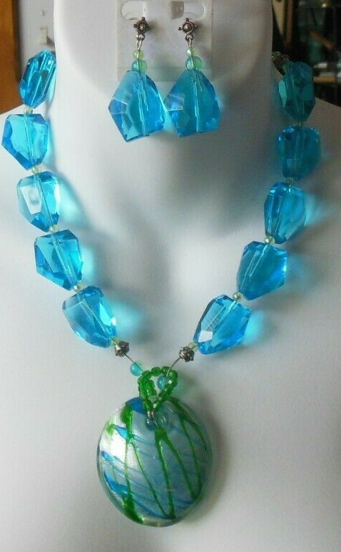 Vintage Heavy Blue Multi-Faceted Glass Foiled Pendant Necklace Earrings Set
