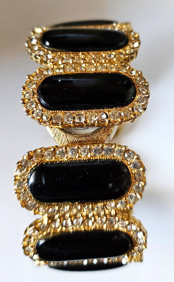 Vintage Norman Swiss Made Black CAB & Clear Rhinstones Bangle Watch Wind-up